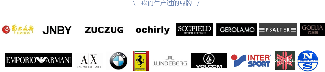 新元服裝擁有一支有著豐富經(jīng)驗(yàn)和忠于職守的專業(yè)團(tuán)隊(duì),以誠信為本,嚴(yán)謹(jǐn)務(wù)實(shí),重視質(zhì)量和交期,與國(guó)內(nèi)外的多家客戶建立了長(zhǎng)期良好的合作關(guān)系,公司的服務(wù)的國(guó)內(nèi)外品牌包括: